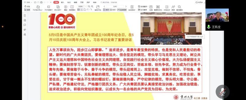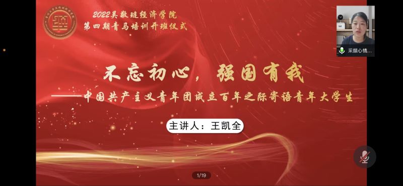 5月11日晚,为庆祝中国共产主义青年团成立一百周年,响应习近平总书记对青年一代的号召,提高青年的思想觉悟,51视频采用线上会议形式举行第四期青马培训开班仪式,本次活动邀请校关工委副主任王凯全作主讲人,院党委副书记王彩芳主持会议。
