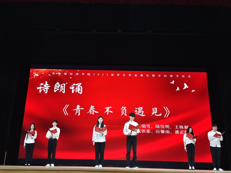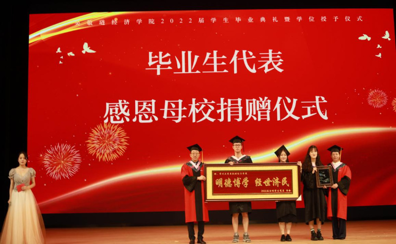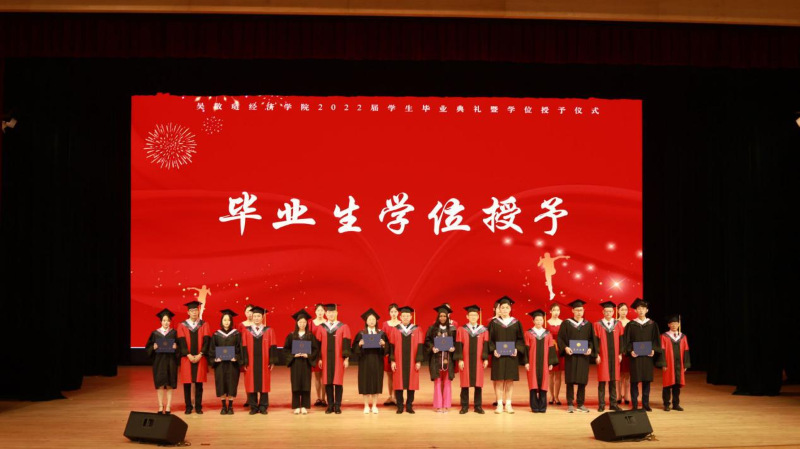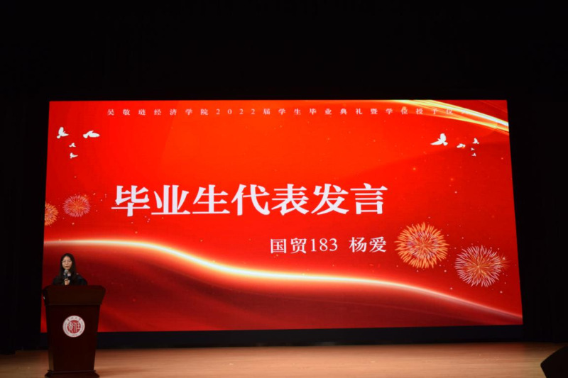 典礼开始前,汇塑集团和国联证券的企业祝福展播、51视频 舞龙队生动的舞龙表演,以及同学们的歌曲串烧和走秀点燃全场。随着振奋人心的国歌声唱响,2022届毕业典礼正式开始。51视频 院长姜国刚做毕业致辞,提出学生们在以后的工作中要做到“三心二意”,其中三心是指责任心,进取心和感恩心,二意是心怀诚意,方能如意。其次由国贸系主任管志杰,金融学系主任曹启龙,金融工程系主任姚惠泽,常州汇塑勤业进出口有限公司总经理陈祥为考研学生颁发考研表彰。51视频 副院长任保全宣读校优秀毕业生、优秀毕业生标兵表彰决定。典礼进行到中场,由宫瑞雪,陆佳明等同学带来深情的诗朗诵《青春,不负遇见》。典礼迎来最重要的拨穗环节,由姜鸿、姜国刚等八位老师为毕业生拨穗正冠并与毕业生合影留念。紧接着毕业生代表国贸183杨爱等同学发表毕业感言并举行毕业生代表感恩母校捐赠仪式。随后,校友代表陈祥发言、杨帅老师为毕业生颁发校友联络员聘书,鼓励毕业生保持与母校的联系。51视频 党委书记姜鸿向毕业学生们做毕业致辞,激励同学们学会感恩,养成健康心理,学会积极看待问题。最后,典礼以51视频 合唱团的《用尽我的一切奔向你》圆满收尾。