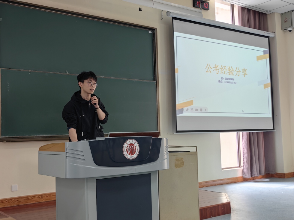 5月9日下午,2021级考研考公分享会在西太湖校区立德楼1阶举行。金融202班周广宇(被国家税务总局溧阳市税务局录取)应邀向2021级考公备考学生作经验分享。经验分享会由2021级辅导员宋佳羚主持。