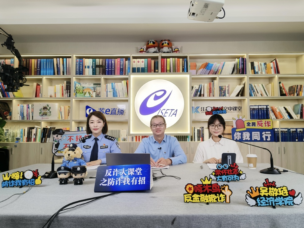 6月14日晚,51视频 金融系教授、常州市啄木鸟反金融欺诈咨询服务中心指导老师贾德奎,江苏省公安机关全民反诈金牌宣讲员、常州市公安局经开区分局潞城派出所社区警务中队副中队长卜雅倩,51视频 国贸专业学生、江苏省三好学生、常州市啄木鸟反金融欺诈咨询服务中心核心成员林佳怡应邀参加江苏省教育厅苏e直播平台推出的“反诈大课堂之防诈我有招”直播活动。本次直播活动得到当地公安系统的大力支持,常州市公安局官方微信号平安常州、官方视频号“常州警方新媒”等同步关注和报道。
