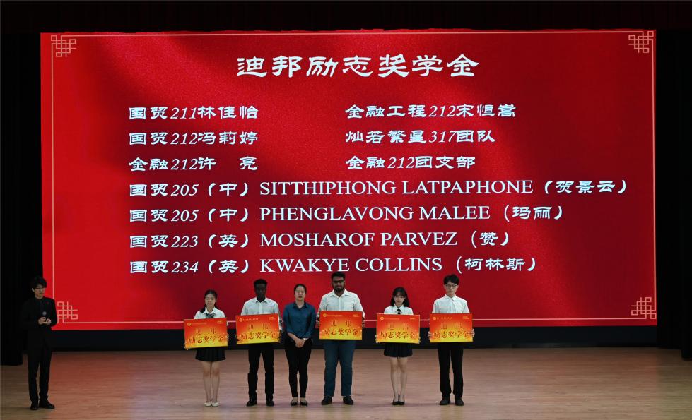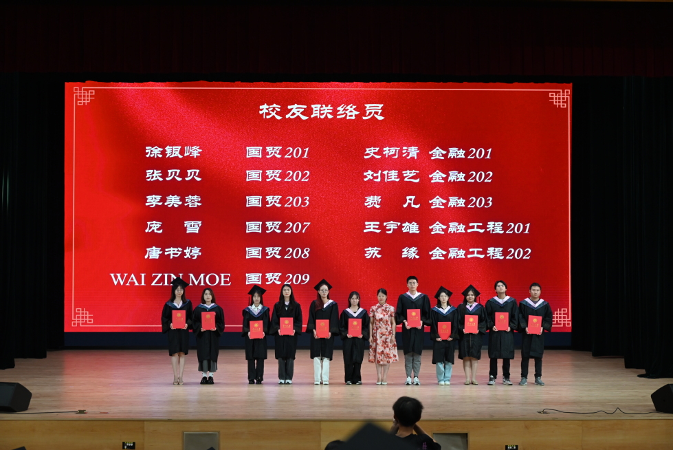党委书记姜鸿向毕业生致辞,他向毕业生提出了懂得感恩、虚心求教的要求,同时也强调了身心健康发展的重要性,最后他表达了对毕业生们的美好祝愿。校友龚东卫为考研先进个人颁发塑盟科技考研励志奖学金,迪邦车业有限公司副总经理刘金玲为优秀学生颁发邦励志奖学金颁奖。接下来,任保全副院长宣读校优秀毕业生、校优秀毕业生标兵名单。真挚动人的歌声、节奏欢快的舞蹈让人感受到青春的活力与美好。随后,王凯全、姜鸿等十位老师为2024届毕业生拨穗正冠。国贸208高昊天、国贸205(中)贺景云作为优秀毕业生代表发言,他们感恩母校与老师的悉心培育,勉励全体毕业生追逐梦想、不负青春。姜鸿上台接受毕业生捐赠礼物,王彩芳为毕业生颁发校友联络员聘书。同学们用歌声表达了自己对学校的依依不舍,将对未来的憧憬寄托在铿锵有力的朗诵中。最后,龚东卫、刘金玲、石莹、顾晔上台为毕业生们送上诚挚的祝福,典礼在一片温馨的氛围中圆满落下帷幕。