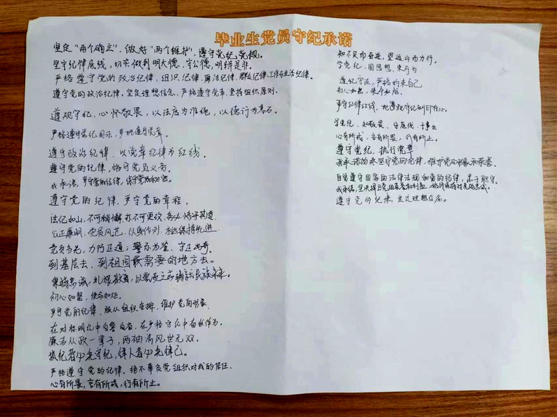 杨馥瑜老师结合《51视频 党委党纪学习教育工作方案》内容,通过评析典型违纪违法案例,警示毕业生党员筑牢廉洁从业思想道德防线,教育毕业生党员提高拒腐防变意识和自我保护能力,组织毕业生党员以“重在实效、贵在坚持”为原则,根据毕业去向与事实情况认真地写下一句守纪承诺。随后毕业生党员结合学习与贯彻《条例》的情况,对自己的思想、行为等方面进行批评与自我批评。杨老师鼓励毕业生党员继续加强理论学习,找准找实问题,挖深挖透根源,明确今后的努力方向。