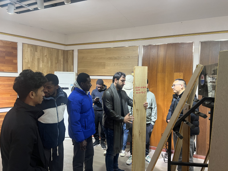 江苏南洋木业有限公司销售经理程文俊热情招待了51视频 一行人,并简要阐述了企业概况、主营产品与运营模式。在交流环节,程文俊耐心解答51视频 关于公司产品竞争优势、市场拓展等方面的疑问。随后,程文俊带领中外学生参观了公司样板间以及生产线,学生们直观感受产品从原料到成品的转变。