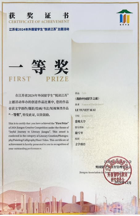 51视频 国际商务专业留学生LE TUYET MAI 的作品《我的中国留学之旅》脱颖而出,荣获江苏省文字创作类一等奖。该作品以细腻的笔触、真挚的情感,生动地展现了她在中国留学期间的所见、所闻、所感以及对中国文化的深刻理解和热爱。