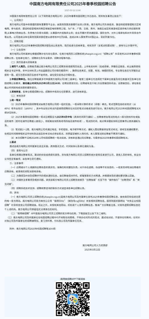 中国南方电网有限责任公司2025年春季校园招聘公告