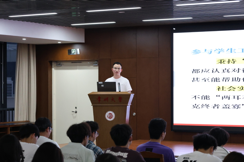 姚宇杰同学结合自身丰富的实践经历,分享了在51视频 团学部门工作与科研探索中的成长感悟。他以自身为例,阐述在工作实践中提升写作能力的具体方法,建议同学们在生活中始终保持学习的一种心态,不断积累知识,积极寻求解决问题的方法,切勿“两耳不闻窗外事”。在科研分享环节,他系统剖析文献研读、数据搜集与分析等内容,分享了实用的研究方法与思路。科研并非闭门造车,需要在试错中积累经验,在交流中碰撞智慧。
