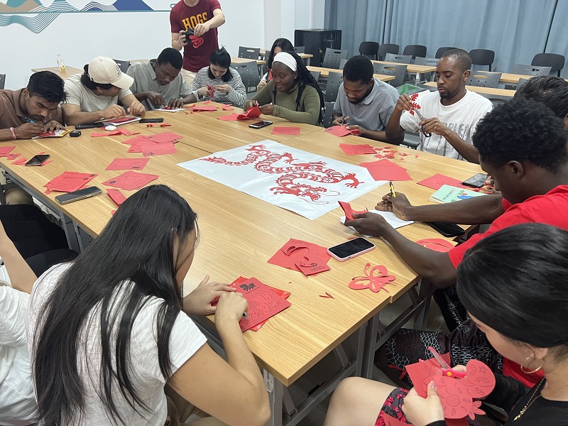 活动伊始,辅导员施雪琴以生动讲解结合文化视频,引领中外学生沉浸式探索中国龙文化的起源、发展及其深厚精神内核。随后,学生们共同体验创意龙形剪纸。现场气氛热烈,大家在协作交流中亲手感受剪纸艺术魅力,将龙文化知识转化为生动的视觉创作,深化了对龙文化精神内涵的理解与共鸣。